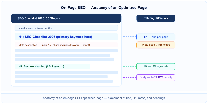 Keep title tags under 60 characters. Place the primary keyword near the beginning. Numbers increase CTR โ “SEO Checklist 2026: 55 Steps” outperforms “A Guide to SEO”.
