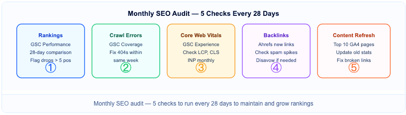 Most SEO guides stop at setup. Ongoing monitoring separates growing sites from ones that plateau. These 5 checks take under 2 hours combined โ run them every month.
