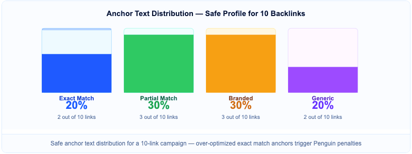 Across any 10-link campaign: 2 exact match, 3 partial match, 3 branded, 2 generic. Map this distribution before writing the first post.