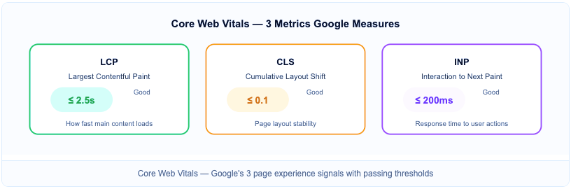 CWV measures 3 signals: LCP (Largest Contentful Paint) under 2.5s, CLS (Cumulative Layout Shift) below 0.1, and INP (Interaction to Next Paint) under 200ms. Check current scores in GSC > Experience > Core Web Vitals.
