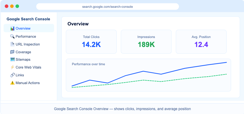 GSC shows which keywords your site ranks for, flags crawl errors, and lets you submit your sitemap. Verify your domain via DNS record or HTML file upload. After verification, submit your sitemap from the Sitemaps section.