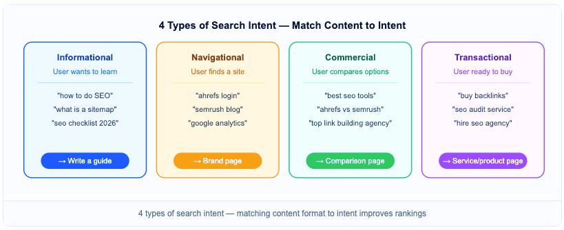 Every keyword has 1 of 4 intents: informational, navigational, commercial, or transactional. Match your content format to the intent. An informational keyword needs a guide, not a product page.